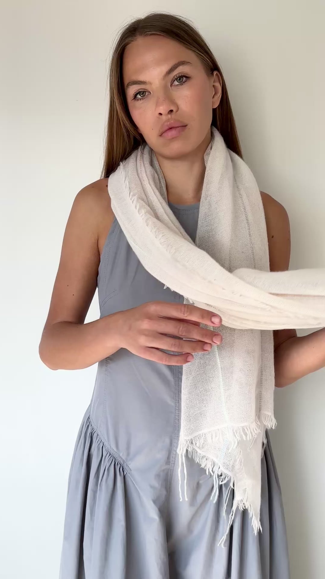 Nettie Cloud - Made with an open mesh weave from luxurious combed cashmere, light, cool tones of soft, pale silver white finished with contrasting ribs of thick cashmere yarn in mint, pale pink and ecru